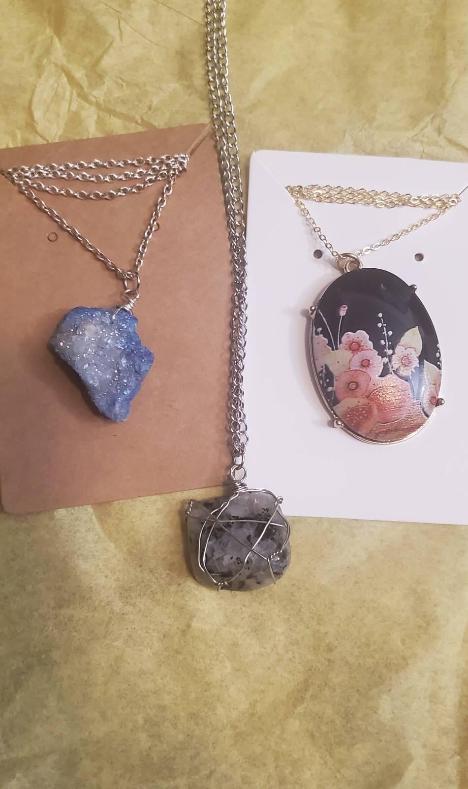 Rainbow moonstone wrapped in copper (gold or silver coloring, non tarnish wire) wire on a silver plated or gold plated cable chain; 5 gold plated necklaces for sales and 3 silver plated necklaces for sale.